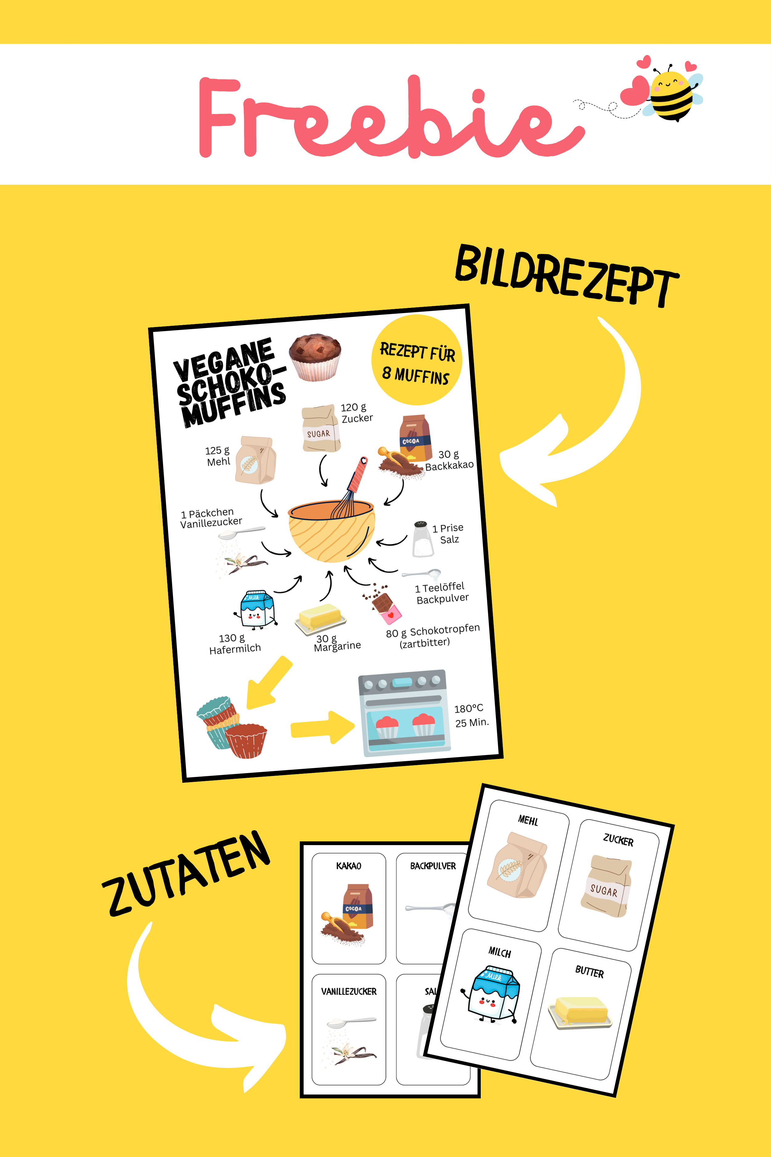 Am Ende des Beitrags habe ich außerdem noch ein einfaches Rezept für dich, um mit deiner Kita-Gruppe vegane Schoko-Muffins zu backen. Das Rezept gibt es direkt als Bildrezept zum Download, inklusive Zutatenkarten, die du für dein Angebot nutzen kannst. So kannst du direkt loslegen!